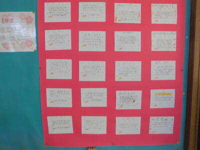 学校の正門と玄関に、一年生が書いた「二年生なってがんばりたいこと」が貼られています。