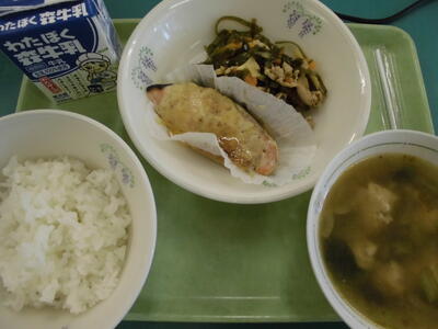 ごはん、牛乳、鮭のみそマヨネーズ焼き、すきこんぶの煮物、肉団子汁、でした。