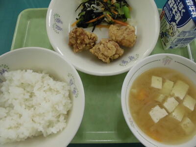 15日の給食は、ごはん、牛乳、とり肉のから揚げ、磯香和え、みそ汁、でした。