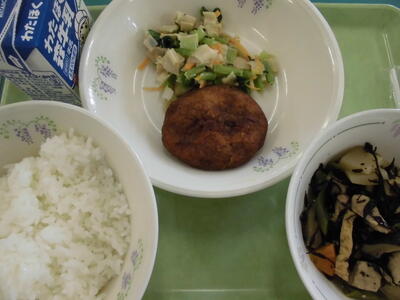 本日の給食は、ごはん、牛乳、ゼリーフライ、青菜とかんぴょうの和えもの、高野豆腐の煮物、でした。