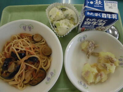 4日の給食は、ナスとトマトのスパゲッティ、牛乳、ジャーマンポテト、こまちゃん蒸しパン、でした。