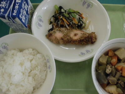 6日の給食は、ごはん、牛乳、鮭のごまみそ焼き、磯香和え、筑前煮、でした。