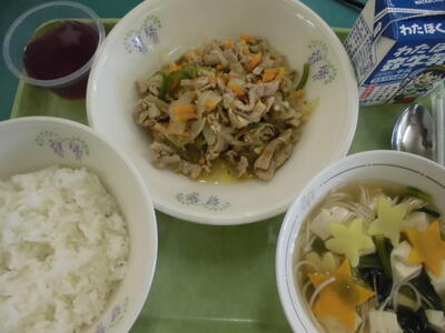 7日の給食は「たなばた献立」。ごはん、牛乳、豚肉の生姜炒め、天の川汁、七夕ゼリー、でした。