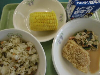 今日の給食は、じゅーしー(沖縄の炊き込みご飯)、牛乳、さばのカレー風味揚げ、青菜とかんぴょうの和え物、とうもろこし、でした。