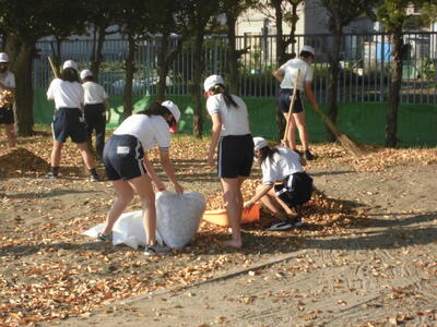 ※現在、学校の枯れ葉が多く落ちて、毎日、児童や職員で落ち葉掃きをしています。学校の外に出てしまう落ち葉も校務員さんが掃き集めていますが、次々と葉が落ちます。今後も、落ち葉掃きを続けていきます。