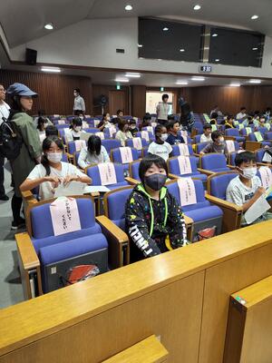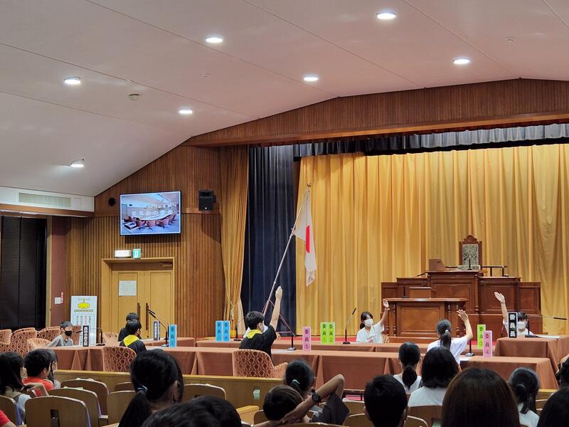 審議委員会や国会の体験を行いました。代表が食育法案を説明しています。
