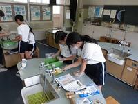 理科室から何やら机をたたく音が聞こえてきました。行ってみると、6年生が「たたき染め」の実験をしていました。シロツメクサをろ紙に挟んで木槌でトントン、トントン。たたいて、たたいてろ紙にしみこませます。その後薬品処理をして、ヨウ素液に浸しました。ヨウ素液といえば、ご存じの方も多いと思いますが、デンプンに反応して青紫色に変色する液体です。葉が光合成をしてデンプンが生成されていることを確かめる実験でした。結果は多くの班がうまくいったようです。トマト同様、夏の日差しを浴び、たくさん光合成していました。