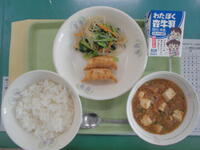 今日のメニューは、牛乳、揚げぎょうざ、中華サラダ、麻婆豆腐です。