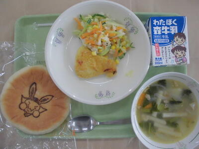 今日のメニューは、小渕っ子パン、牛乳、タンドリーチキン、コールスローサラダ、マカロニスープです。