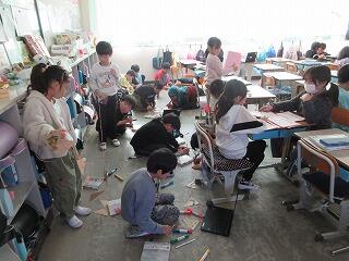 ★理科の時間、ゴムの力をコントロールする学習をしていました。車のはやさや停車する場所をコントロールしようと思考錯誤していました。とても意欲的に取り組んでいました。