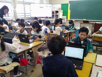 2年生がタブレットで何か新しいことにチャレンジしています。