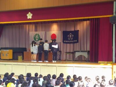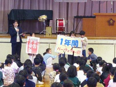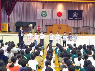 その後、3月の生活目標の発表です。代表の1年生が前に立ち、先生の話に合わせながら