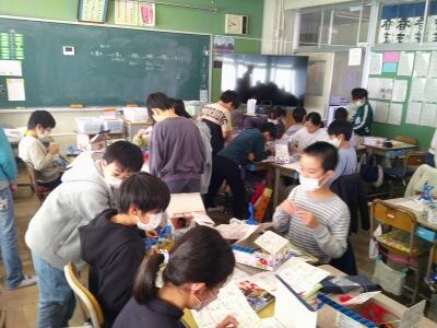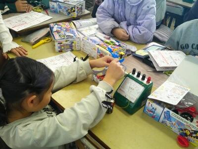 5年生がキットを作成し、いよいよ電流を流す実験です。