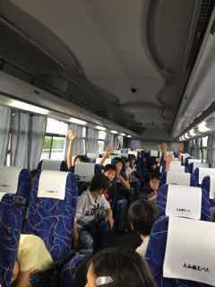 出発式を終え、元気よくバスに乗車しました。朝早い出発でしたが、子どもたちは元気いっぱいです。まもなく高速道路に入ります。