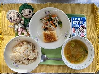 6月4日から10日は、歯と口の健康週間です。歯と口を健康に保つ第一歩は、よく噛んで食べることです。今日の給食では、噛みごたえのあるメニューを取り入れました。