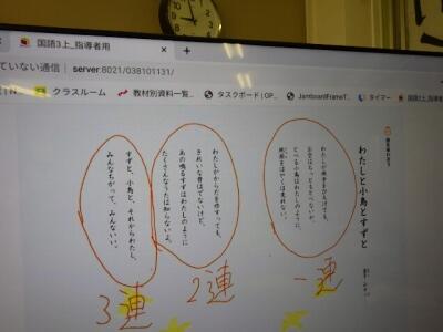 モニターの画面は先生の手作り教材です。
