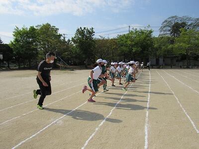 4年生と教頭先生が競走です。教頭先生は、元陸上部ですよ。