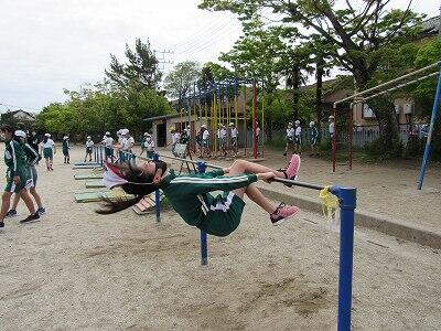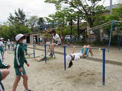 ◆4年生も、鉄棒で逆上がりと腕立て後転を練習しています。
