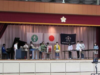 音楽委員会の皆さんの「校歌」演奏に合わせ、各教室では小さな美しい声で歌います。