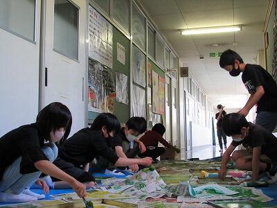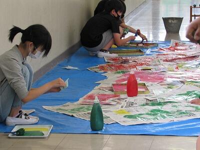 ◆管理棟2階のろう下を5年生が独り占めです。色インクを使って造形遊びかな?
