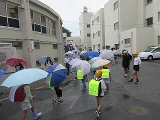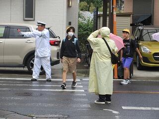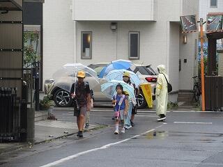 雨の中、交通指導員さん、保護者の方に見守られ登校です。