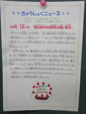 ★今日は、春日部市市制20周年記念お祝い給食でした。