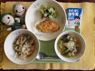 キャベツ入りメンチカツは、みじん切りにしたキャベツがたっぷりと肉だねに入っており、脂っこくなく食べられます。給食室で材料をこねて成形し、中心まで確実に火を通すためにしっかり時間を確認しながら揚げました。調理員の皆さんは、毎日とても丁寧に、上手に調理してくださっています。