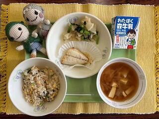 かぼちゃのミートソース焼きは、蒸したかぼちゃとミートソースを和えて、チーズをかけて焼きました。かぼちゃは子どもも好き嫌いが分かれますが、今日はよく食べていました。