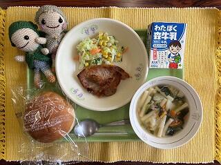 今日の給食の「花野菜のアーリオオーリオ」で使っているブロッコリーとカリフラワーは、どちらも埼玉県での生産量が全国でもトップクラスに入る野菜です。ちなみに、「アーリオオーリオ」は、アーリオがにんにく、オリオがオリーブ油のことを意味しています。スープも野菜たっぷりですが、どの献立もよく食べていました。
