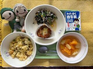 今日はデザートにみかんがあります。みかんも今がちょうど食べごろの果物です。ビタミンCやカロテンなどの体を強くするための栄養素がつまっています。