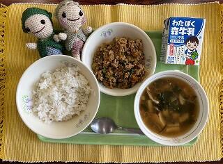 ピリ辛みそ丼は、豚ひき肉と、豚のレバーを細かくしたものや、切り干し大根や小松菜など、栄養価の高い食材がたっぷり入ったメニューです。レバーが苦手でも美味しく食べられたとの感想もあり、どの学年もよく食べていました。