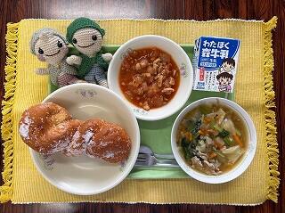 揚げパンは子どもに大人気です。今日は、ツイストパンをサッと揚げて、砂糖をまぶしました。鶏肉のトマト煮も、ワンタンスープも、どちらも揚げパンの日に一緒に出すことが多い献立ですが、どれもよく食べていました。
