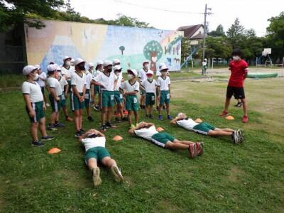 緊急地震速報が流れ、給食室からの火災を想定した避難訓練を行いました。
