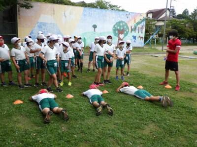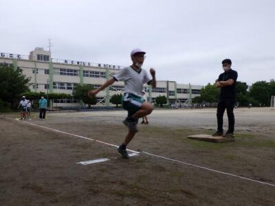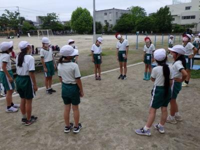 業間休みに、陸上練習参加児童が体育館に集まり、種目ごとに振り返りをしました。