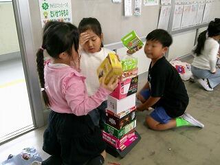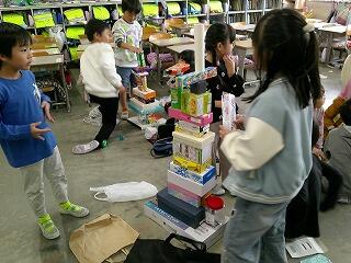 おうちの方と集めてもらった色々な大きさの箱をグループごとに合わせて、どんな形ができるか相談しながら積み上げていきました。