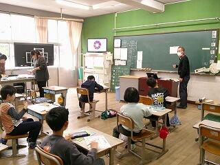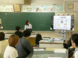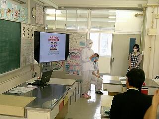 まず初めに本校の学校給食について、チーフからは調理に関する衛生管理について、栄養士さんからは給食の献立や栄養に関するお話をしてもらいました。