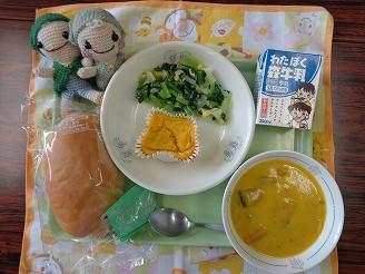 読書週間とコラボレーションした献立で、低学年になじみのある「こまったさんのコロッケ」の本の中にある料理を給食に取り入れました。