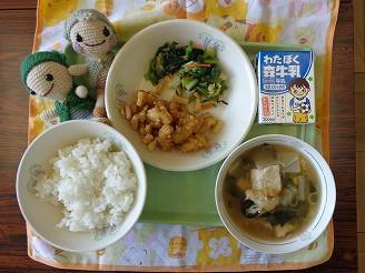 目によい食品(小松菜・じゃがいも・ブルーベリー)を使った献立です。小松菜に含まれている「カロテン」は、目の働き助けてくれ、じゃがいもに含まれる「ビタミンC」は、目をいきいきとさせてくれます。また、ブルーベリーに含まれる「アントシアニン」は、疲れた目を回復させてくれる働きがあります。
