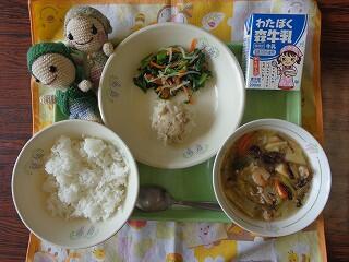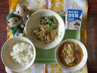 6年生が考えた献立です。旬の野菜をたくさん使用し、体があたたまるようにしょうがやにんにくを使用して味付けを工夫した献立です。