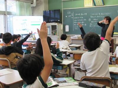 ◆3年生の外国語活動は、DVDに合わせ、体をいっぱいに使ってチャンツを楽しんでいるよ。