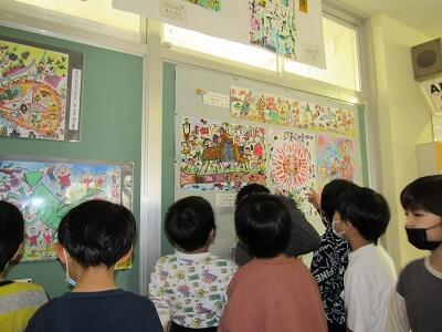 表現活動の途中で、何人かの児童の作品を鑑賞することで、鑑賞と表現を行きつ戻りつさせています。