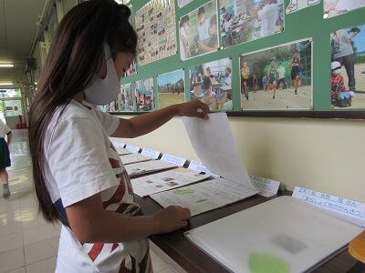 「自由研究・夏」の展示を見て、友だちのよさを学ぼうとしている6年生。