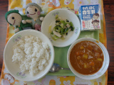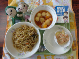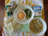 146回目の開校記念日をお祝いした献立です。2月に2年生以上のみなさんに献立を選んでもらい決定しました。汁物には、春日部市の花「藤」をイメージした藤うどんが入ったお吸い物です。