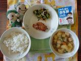 秋の味覚の代表の梨が給食で出ました。梨は、カリウムや水分、食物繊維が多く、おしっこやうんちをすっきり出してくれる働きがあります。