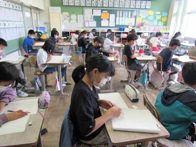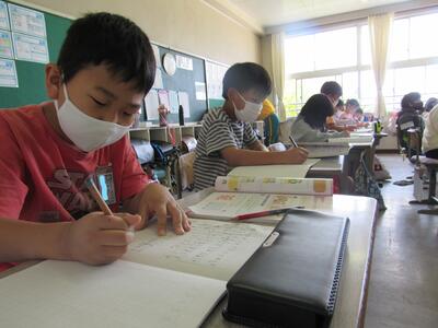 ◆5年生は、硬筆の練習を真剣な表情で行っているよ。