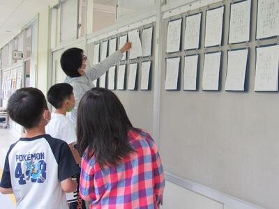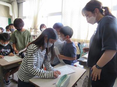 ◆1年生は、学校の敷地内で見つけた草や虫について振り返っているよ。