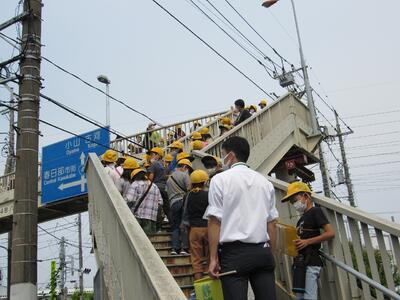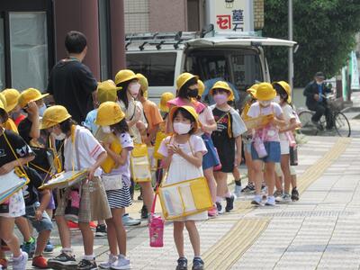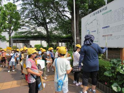 1年生2学級が4つのグループに分かれて、校内をたんけん中です。