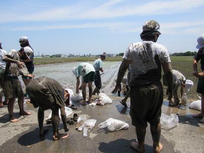 田植えのやり方を丁寧に教えていただき、熱心に耳を傾けているよ。