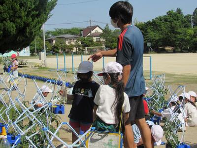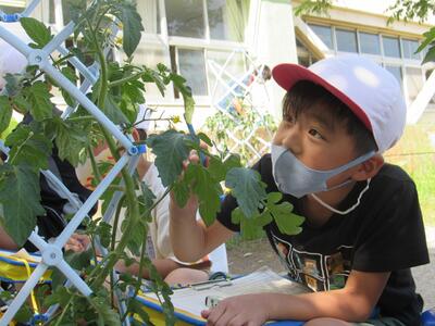 ◆爽やかな校庭で、2年生2クラスがミニトマトの観察をしているよ。