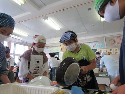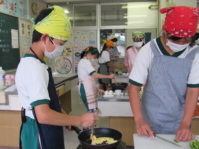 ◆家庭科室では、スクランブルエッグなどの調理実習をする6年生だよ。